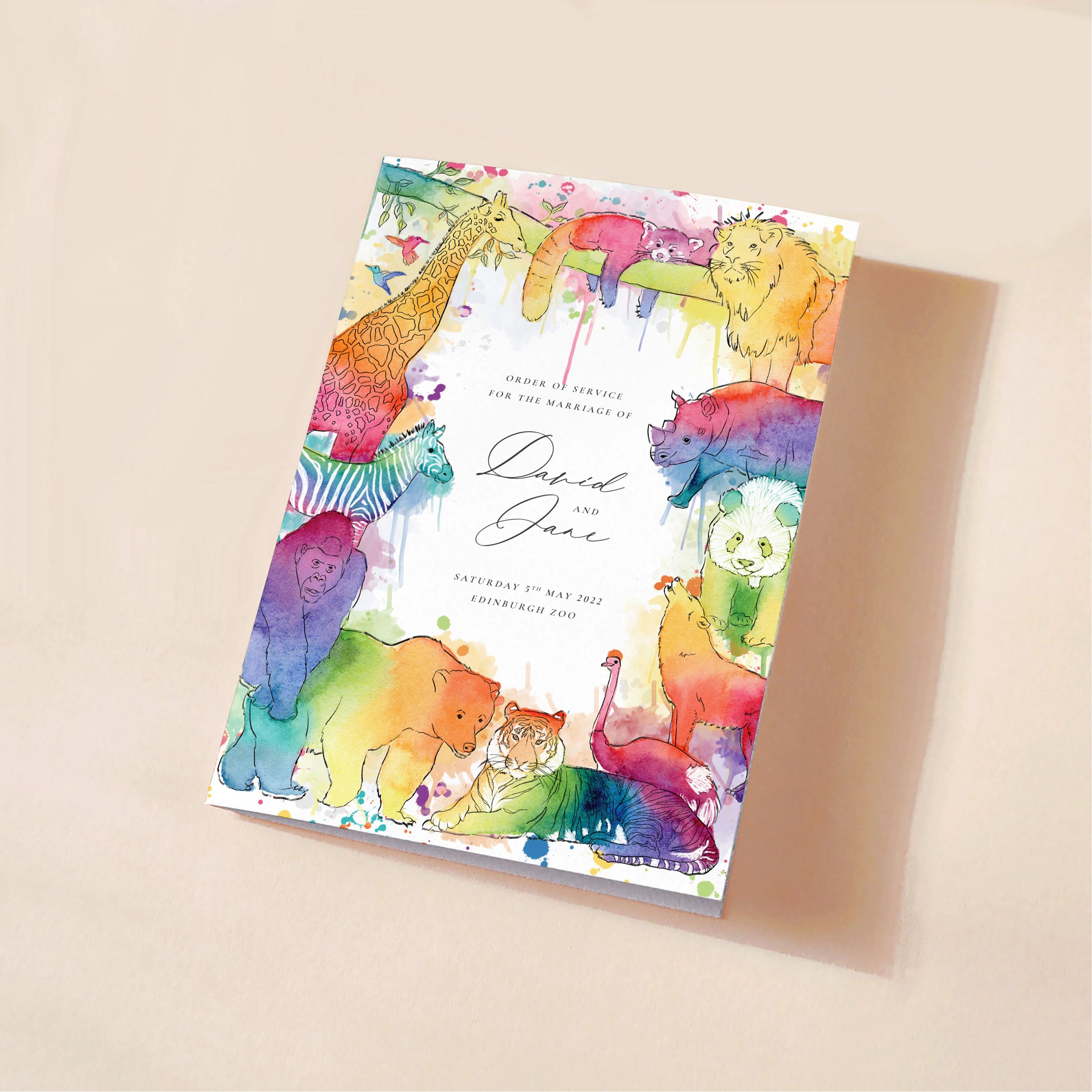 This complete printed wedding stationery package, finished with a bright and colourful animal themed design includes everything you need for your wedding day. Professionally designed and printed on a luxurious Italian paper stock, it’s everything you need to add the perfect finishing touches to your wedding.