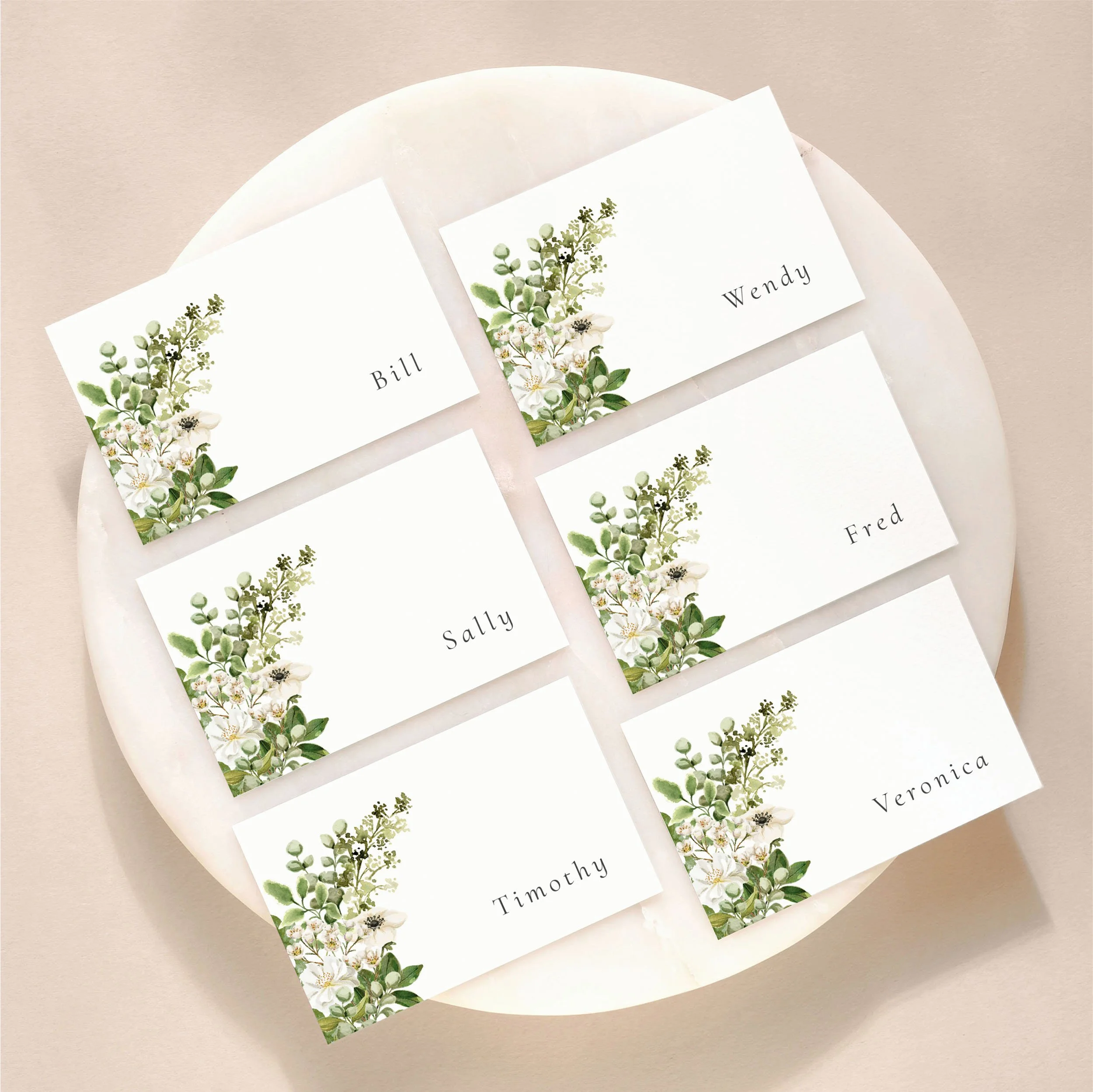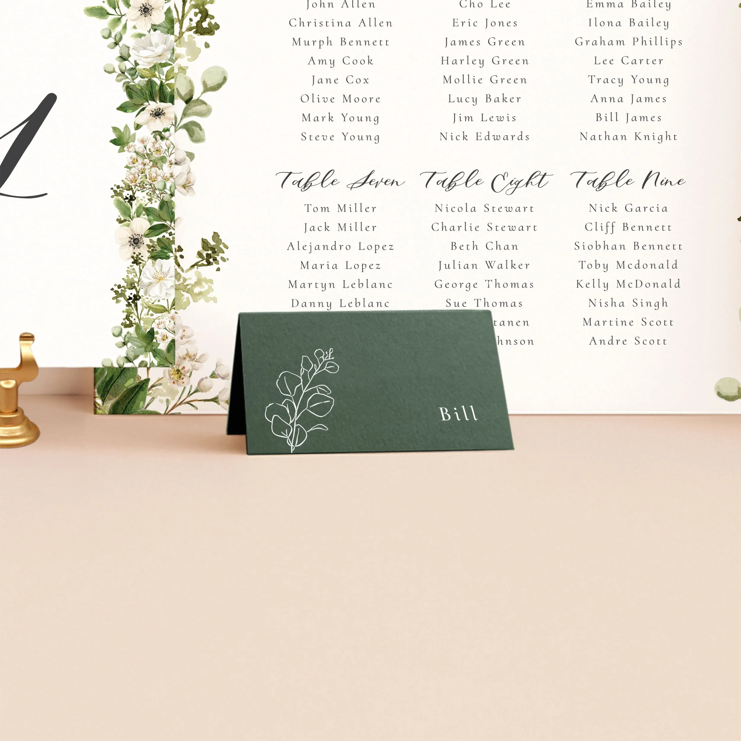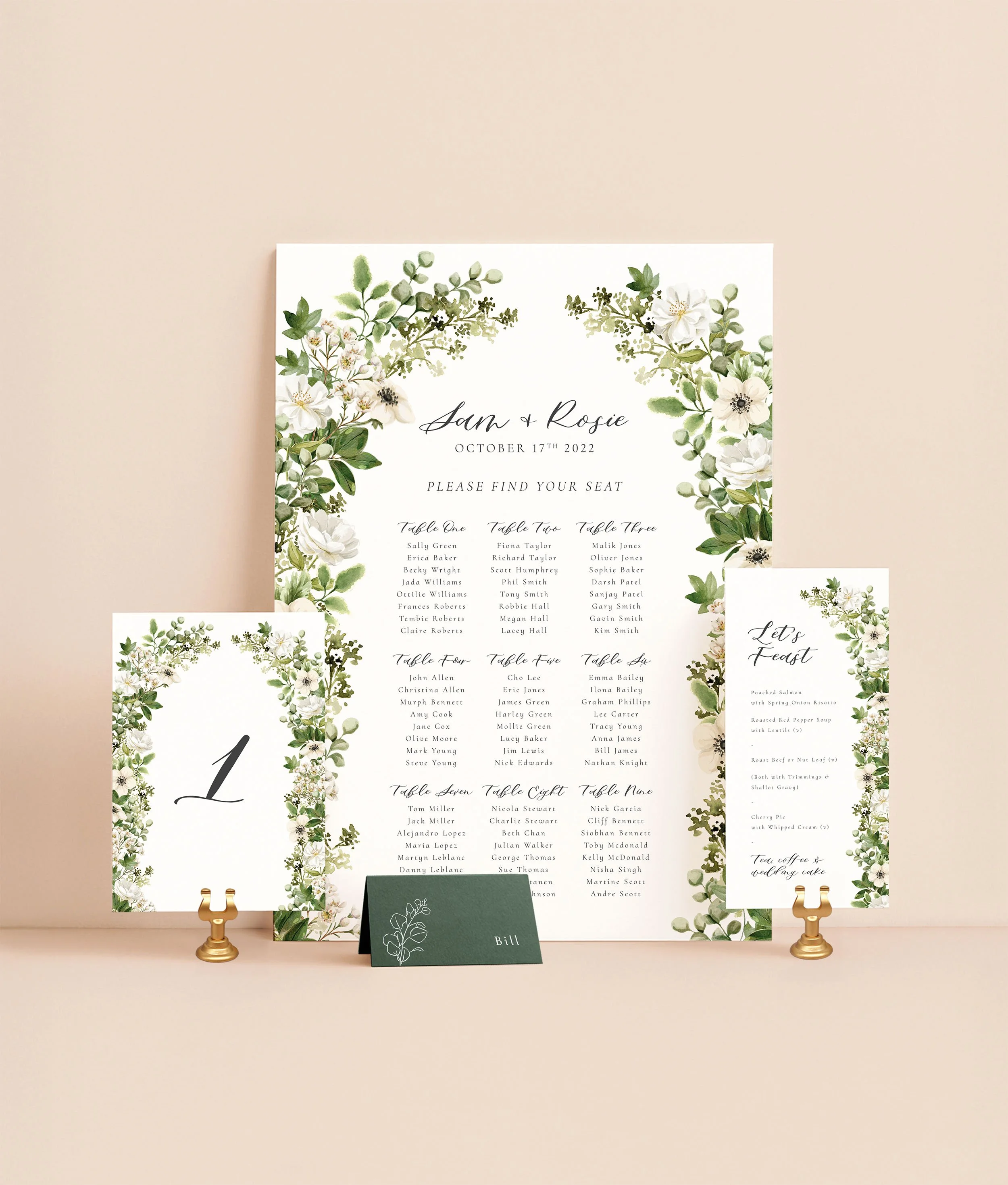 The printed Coppice bundle features rich botanical greenery and hand-painted watercolour florals in soft white tones, inspired by elegant botanical arches. Thoughtfully designed to complement your wedding theme, it brings a timeless, natural touch to your celebration.