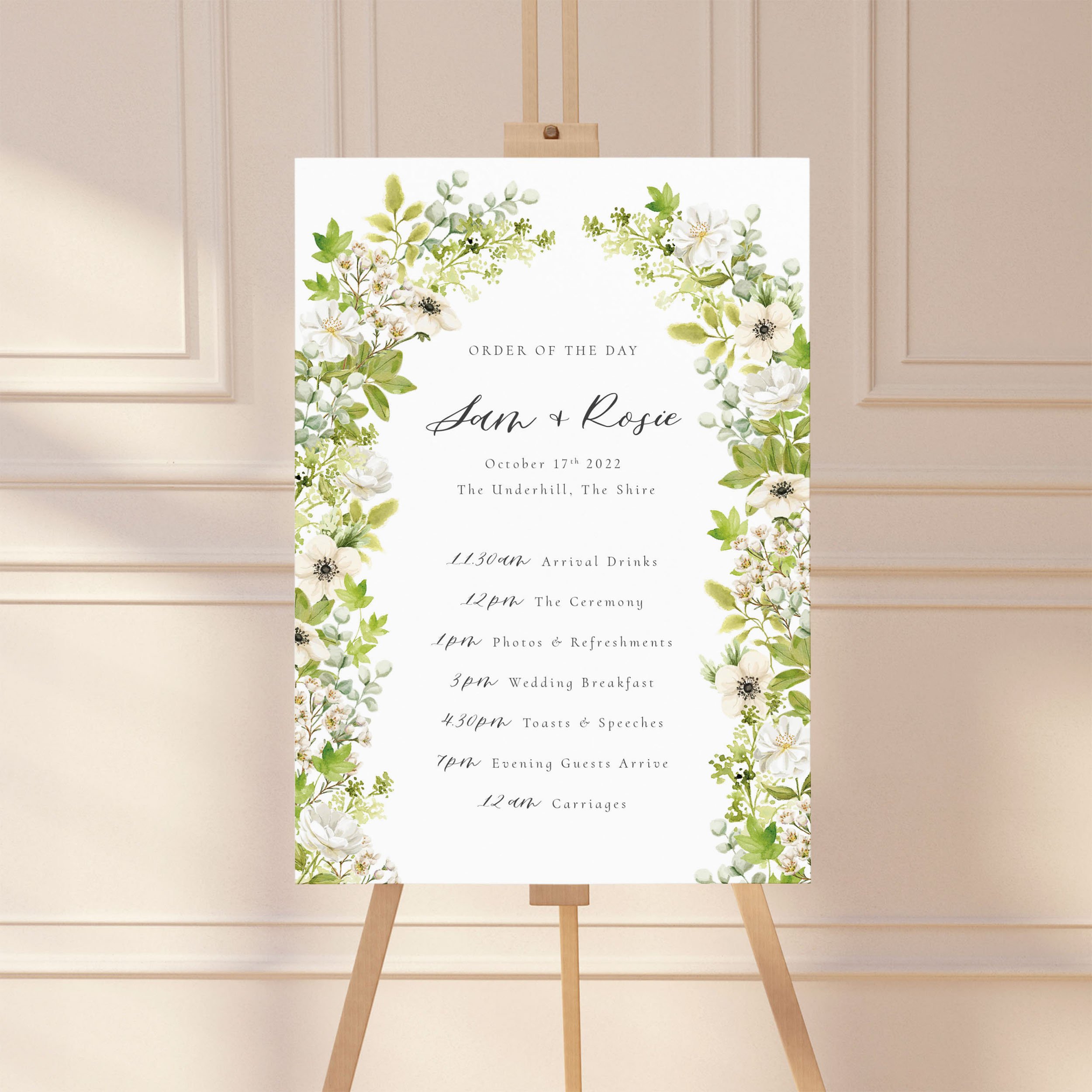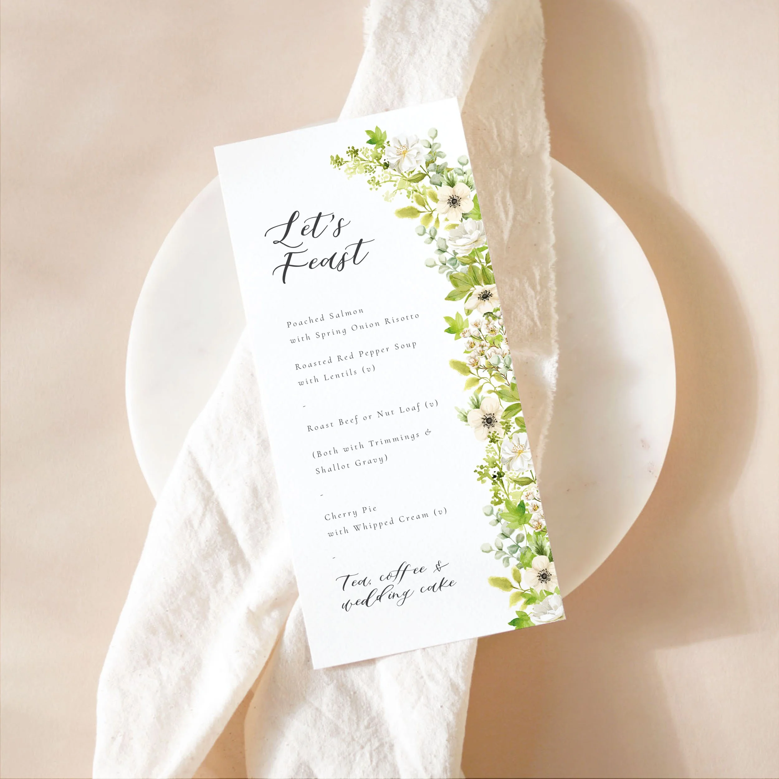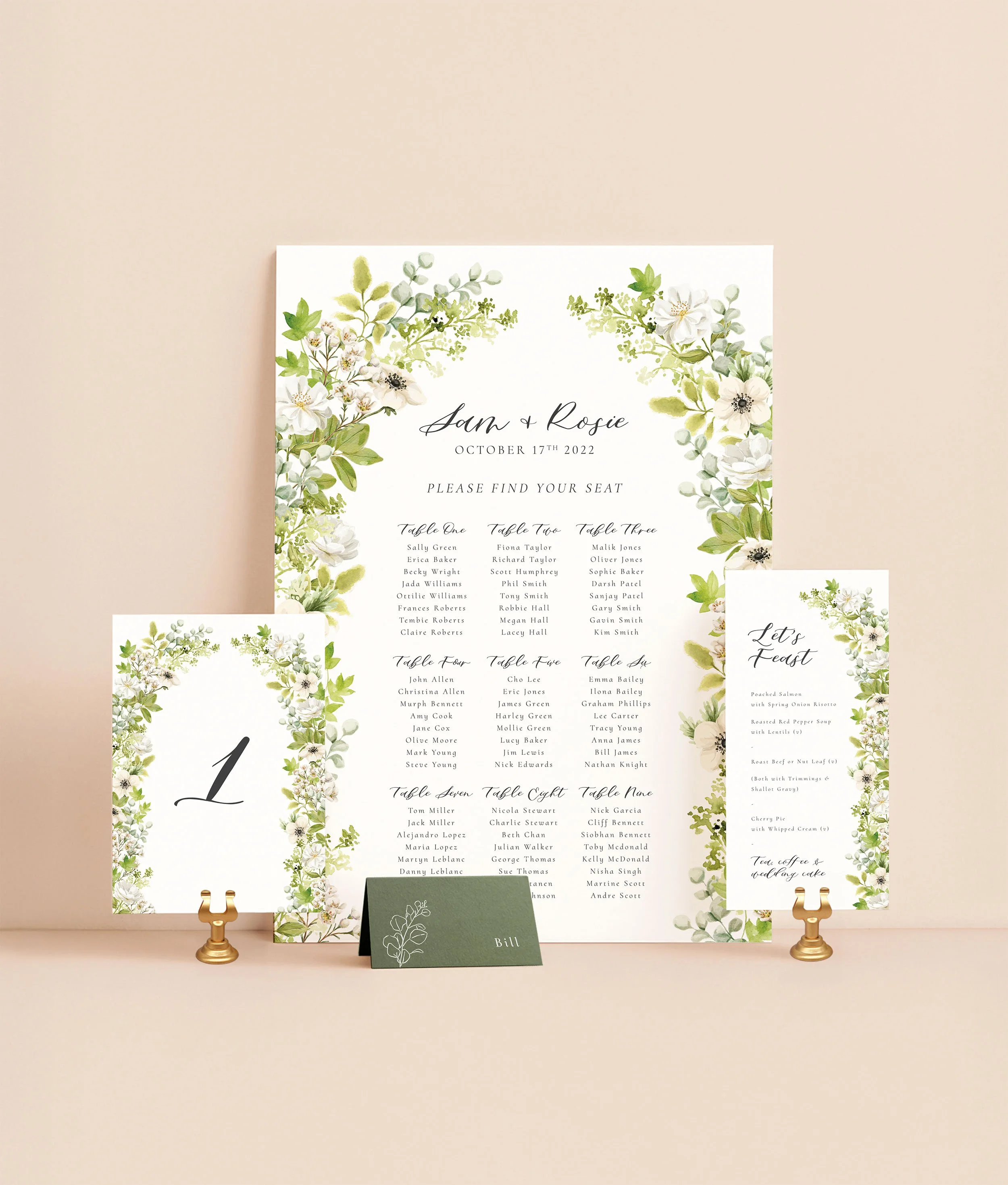 The printed English Garden bundle features lush botanical greenery and hand-painted watercolour florals in soft white tones, inspired by elegant botanical arches. Thoughtfully designed to complement your wedding theme, it brings a timeless, natural touch to your celebration.