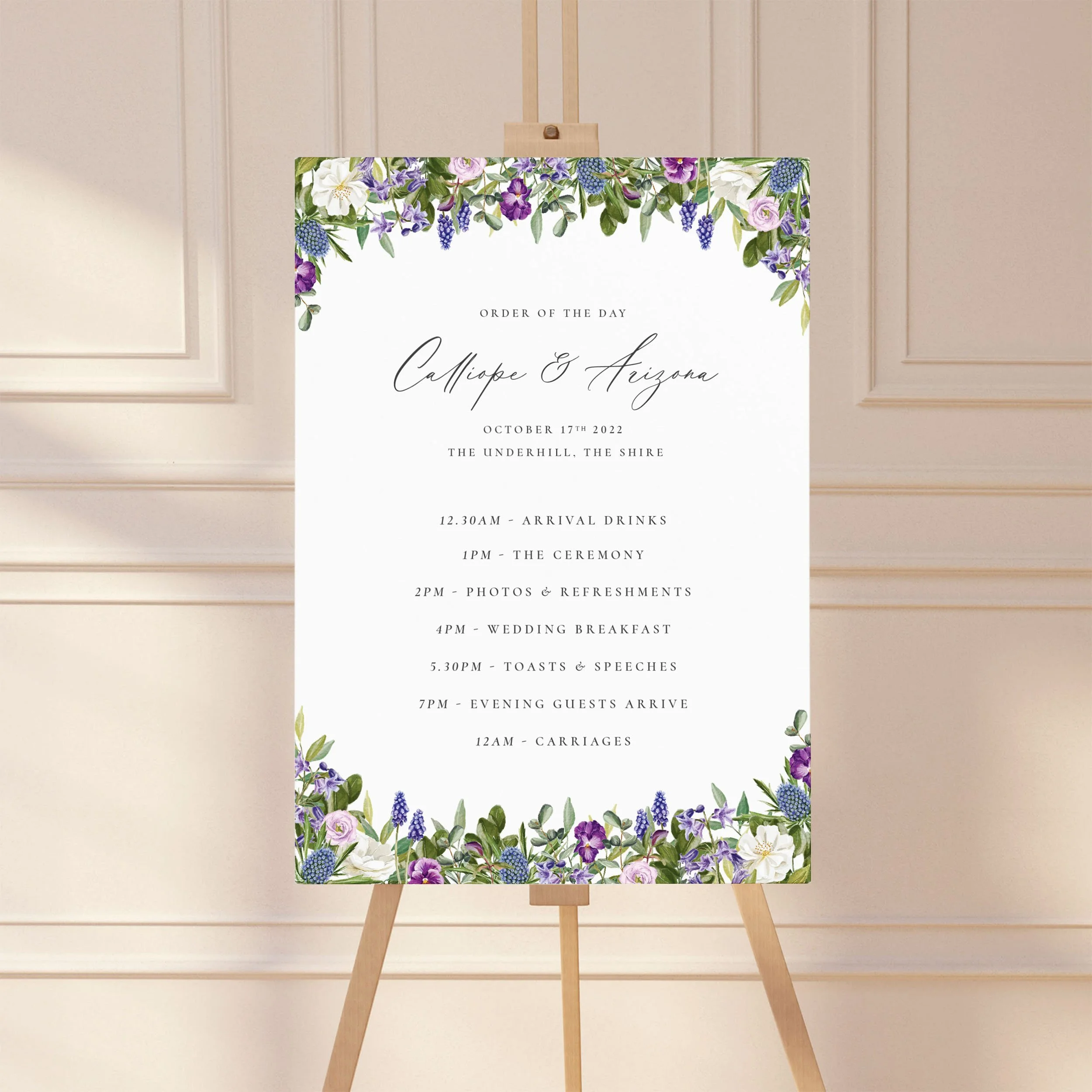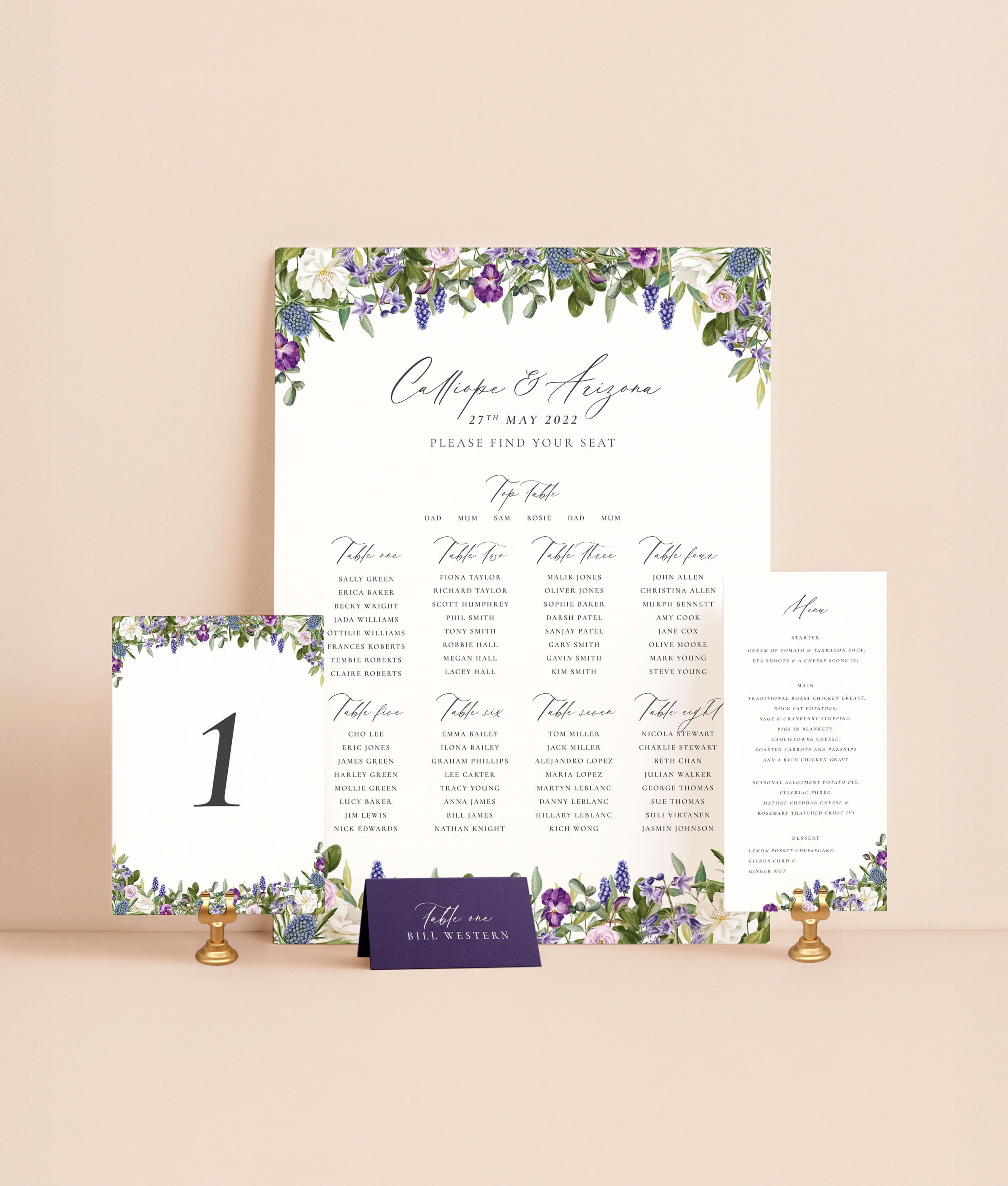 This printed bundle, with rich burgundy florals and lush hand-painted watercolour greenery, includes all the essential stationery for your wedding reception, plus include a welcome sign and order of the day timeline at a discounted price when you order this bundle.
