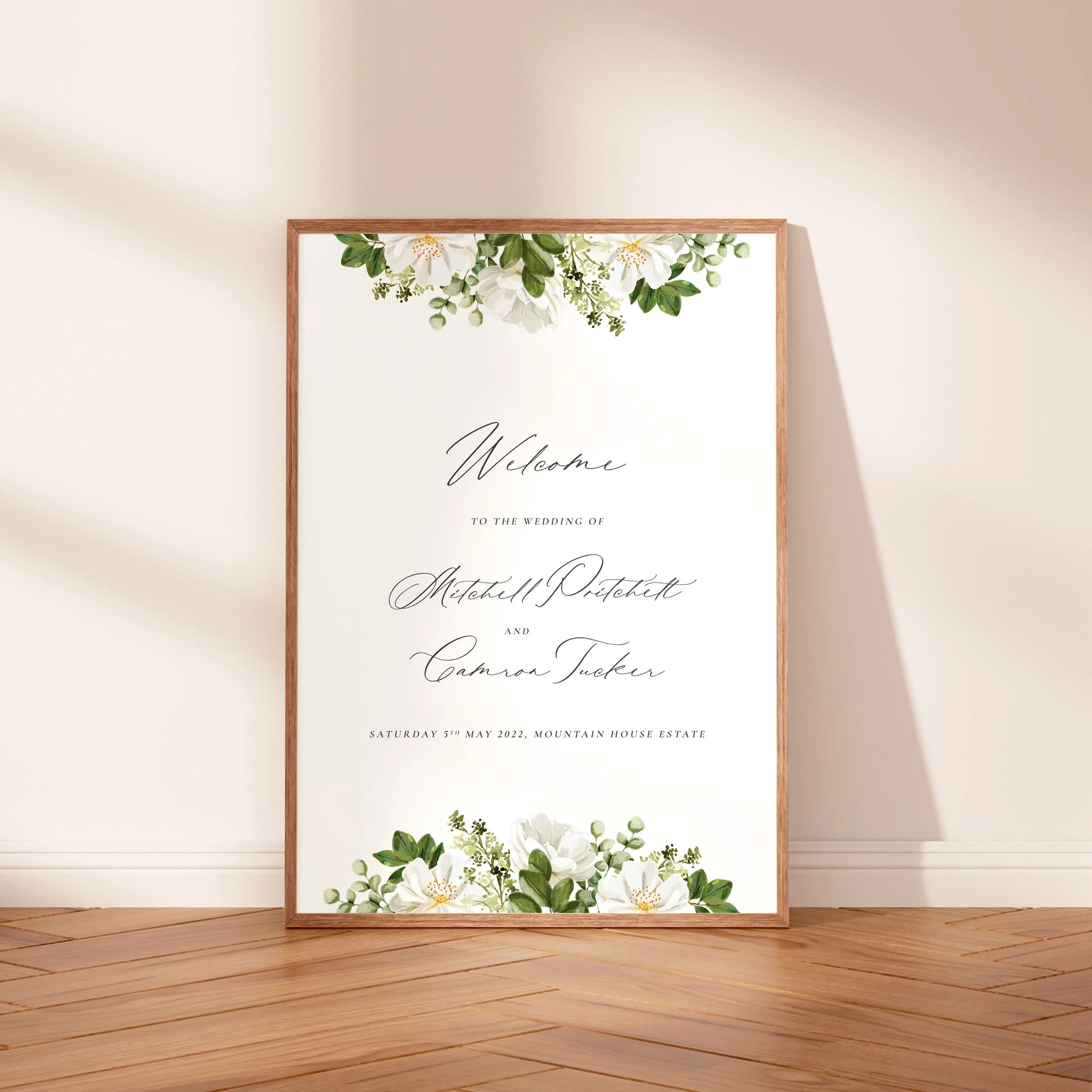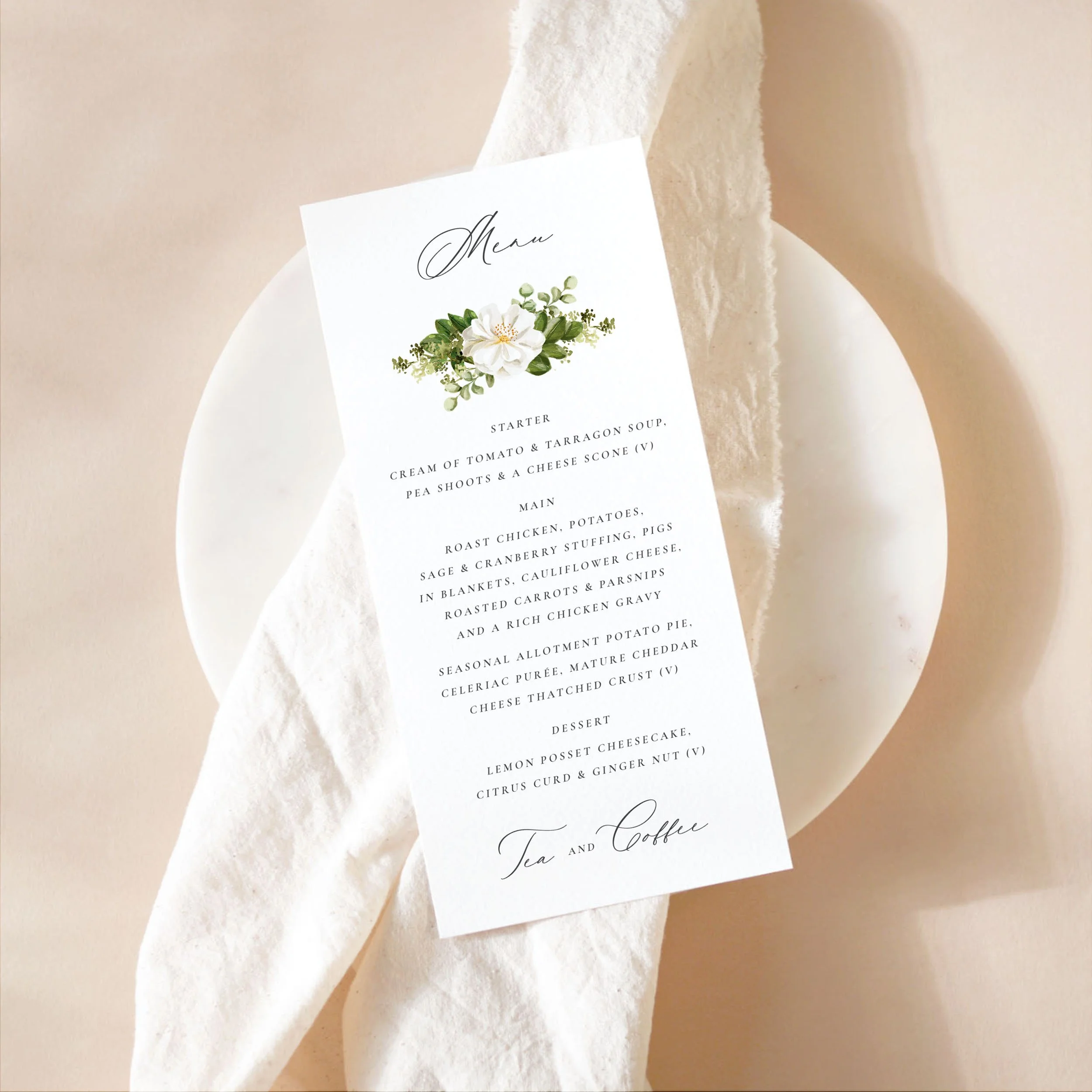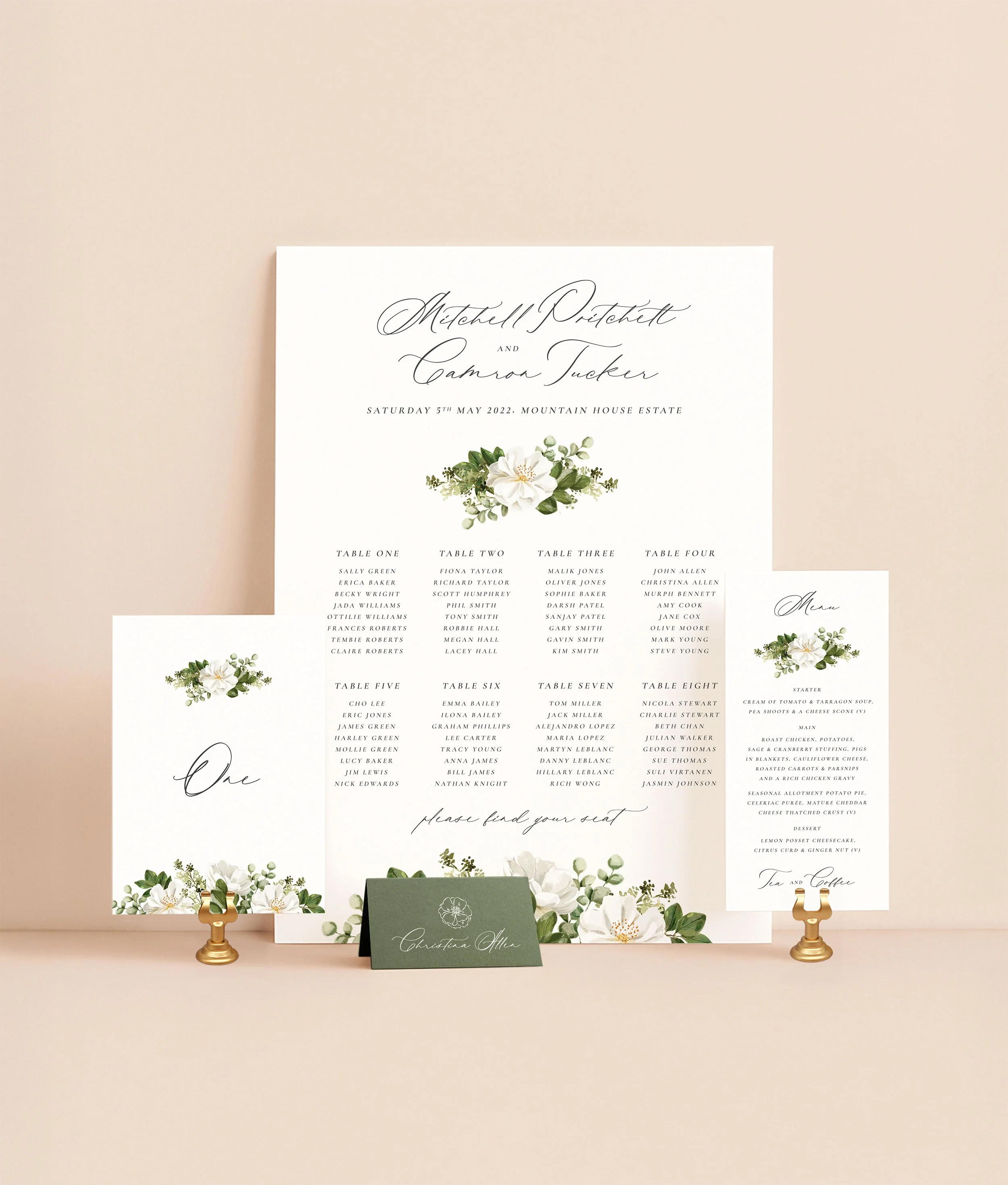 This printed bundle, with rich burgundy florals and lush hand-painted watercolour greenery, includes all the essential stationery for your wedding reception, plus include a welcome sign and order of the day timeline at a discounted price when you order this bundle.
