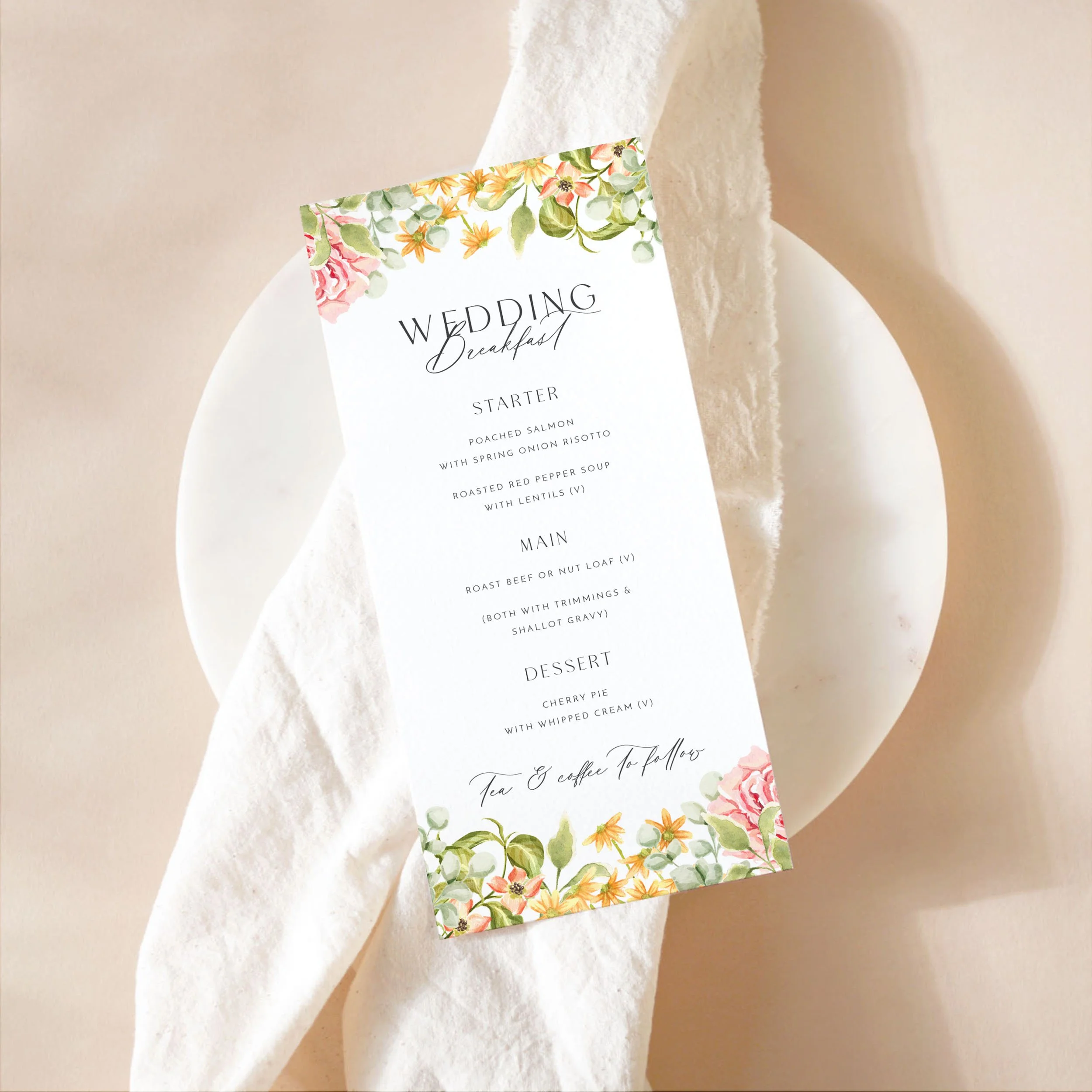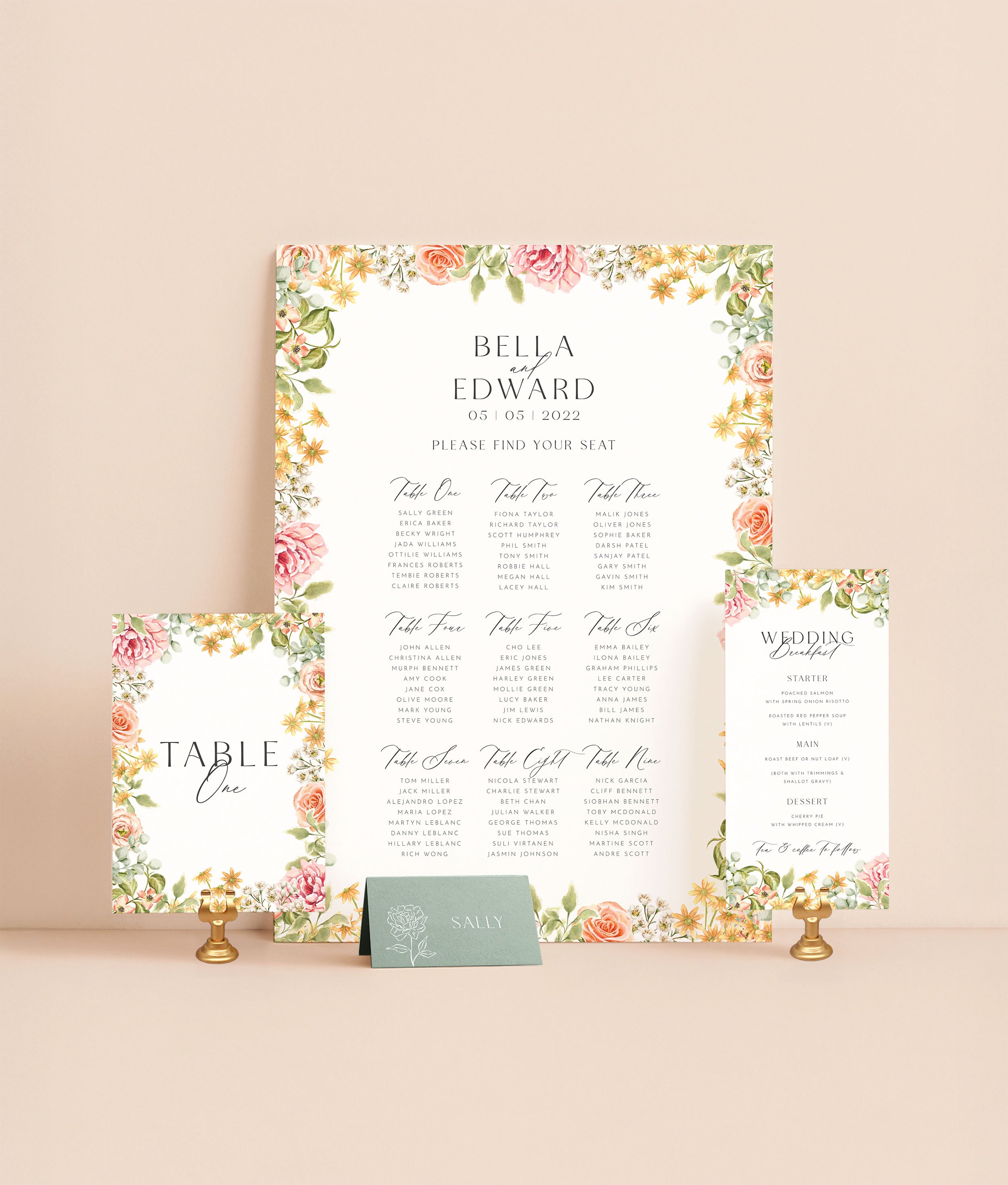This printed bundle, with rich burgundy florals and lush hand-painted watercolour greenery, includes all the essential stationery for your wedding reception, plus include a welcome sign and order of the day timeline at a discounted price when you order this bundle.