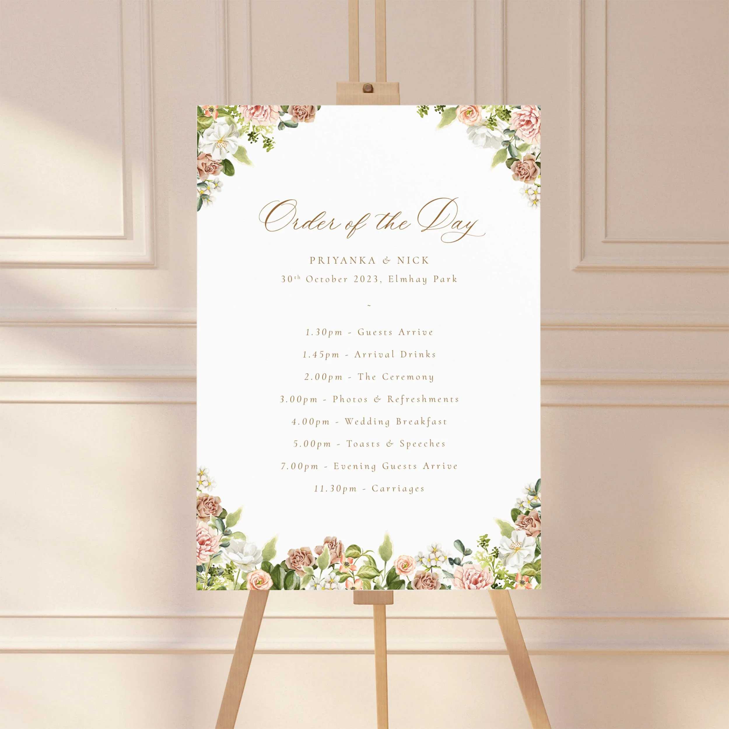 This printed bundle, with rich burgundy florals and lush hand-painted watercolour greenery, includes all the essential stationery for your wedding reception, plus include a welcome sign and order of the day timeline at a discounted price when you order this bundle.
