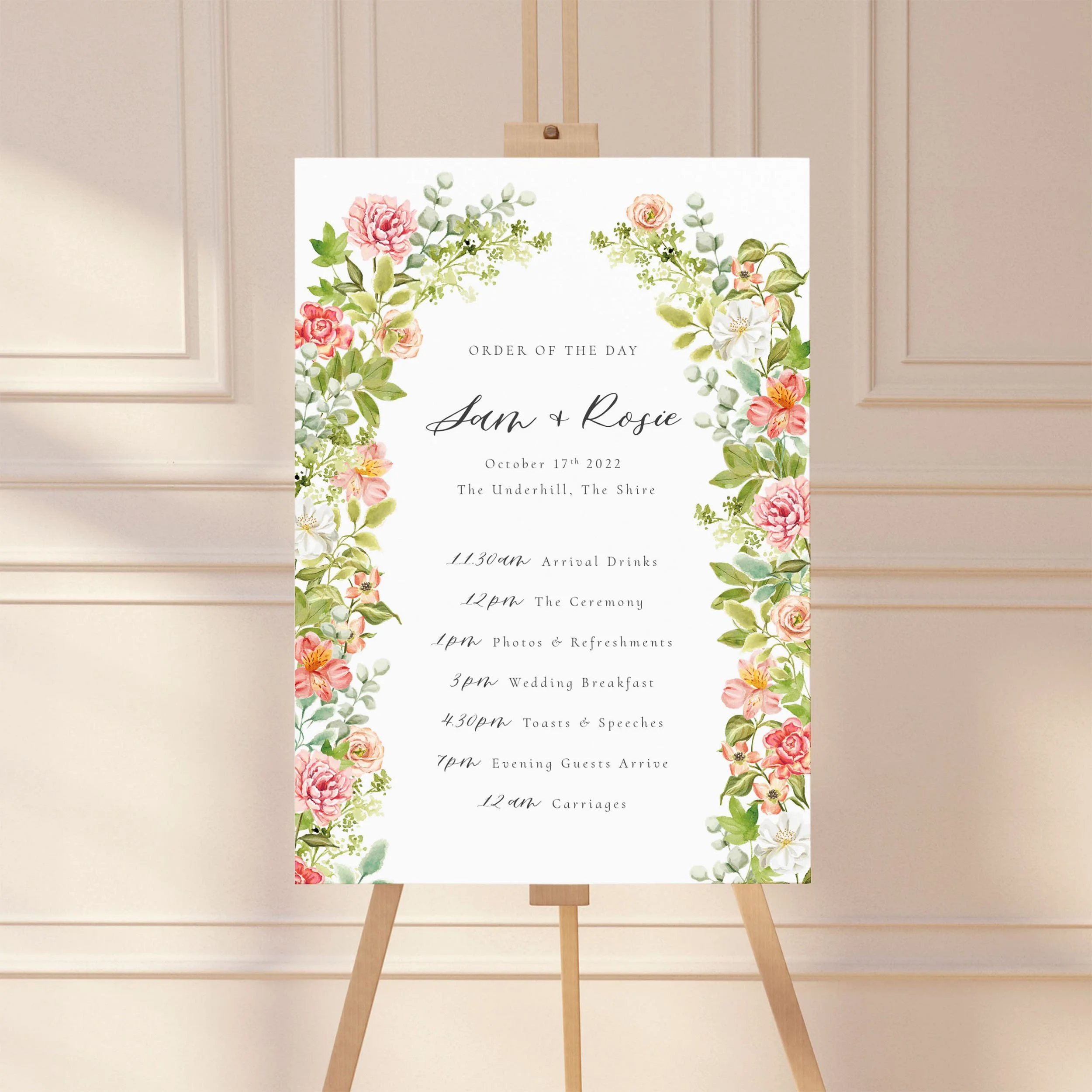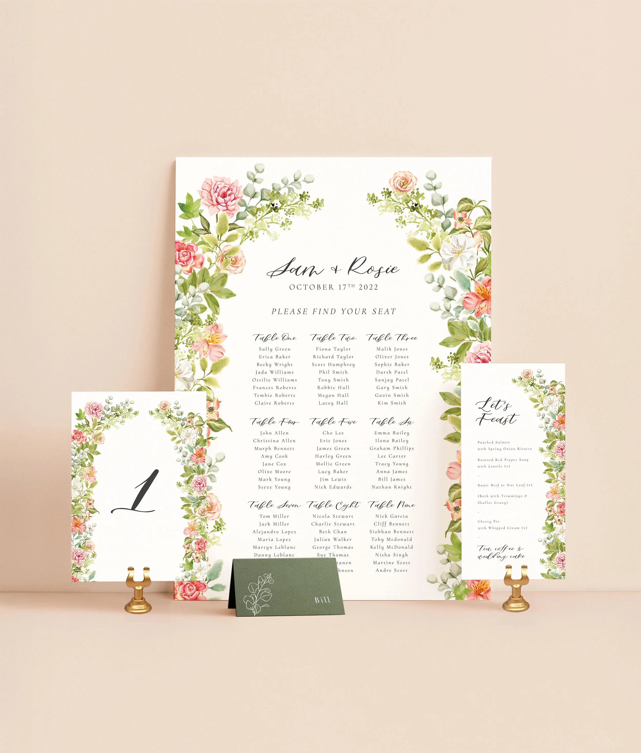 This printed bundle, with rich burgundy florals and lush hand-painted watercolour greenery, includes all the essential stationery for your wedding reception, plus include a welcome sign and order of the day timeline at a discounted price when you order this bundle.