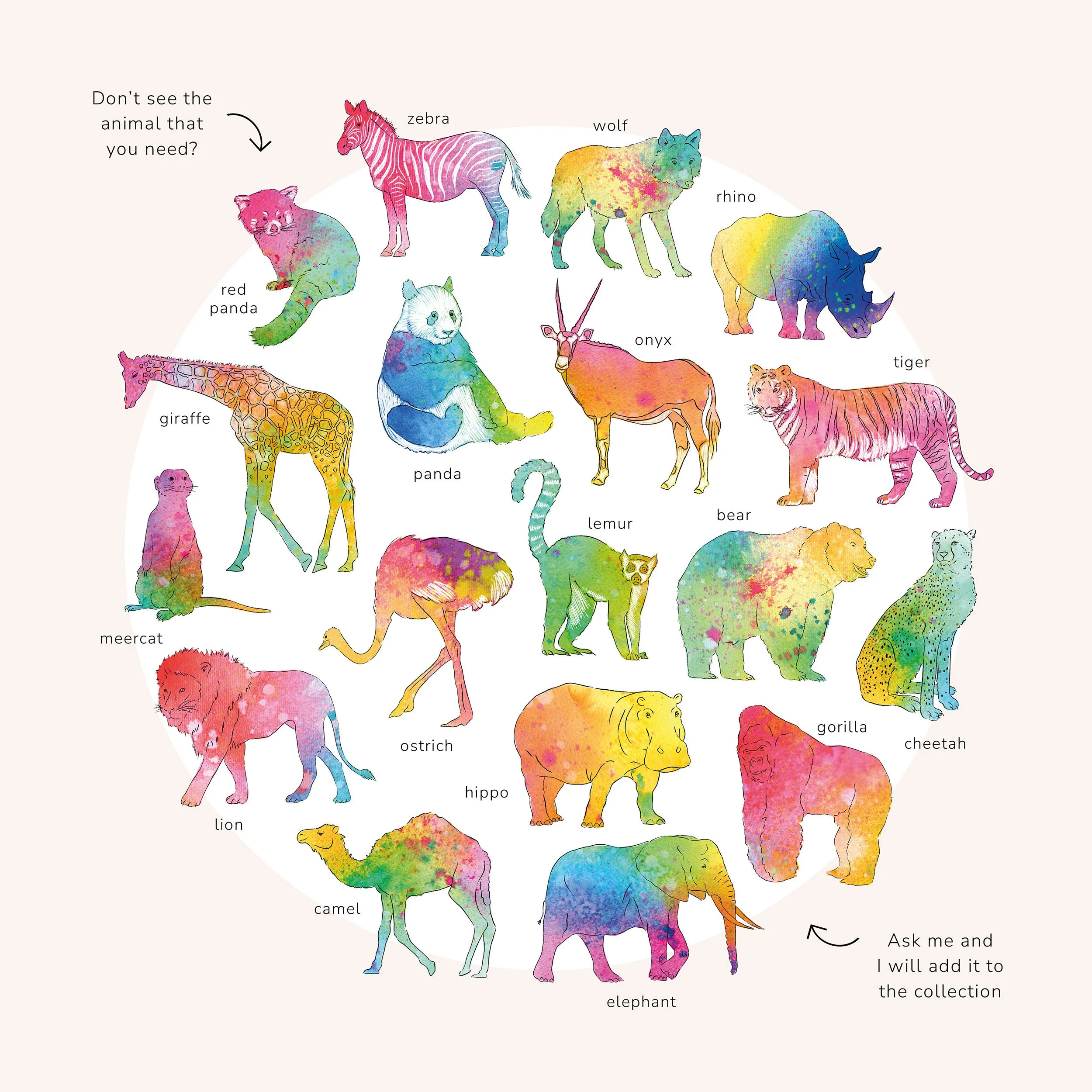 The Prism bundle brings a bold, playful vibe to your celebration, featuring a different hand-painted zoo or safari animal in vibrant rainbow colours for each table. Each piece is framed with a whimsical border of watercolour splashes, adding energy, colour, and personality to your lively zoo, safari park, or animal-themed celebrations.