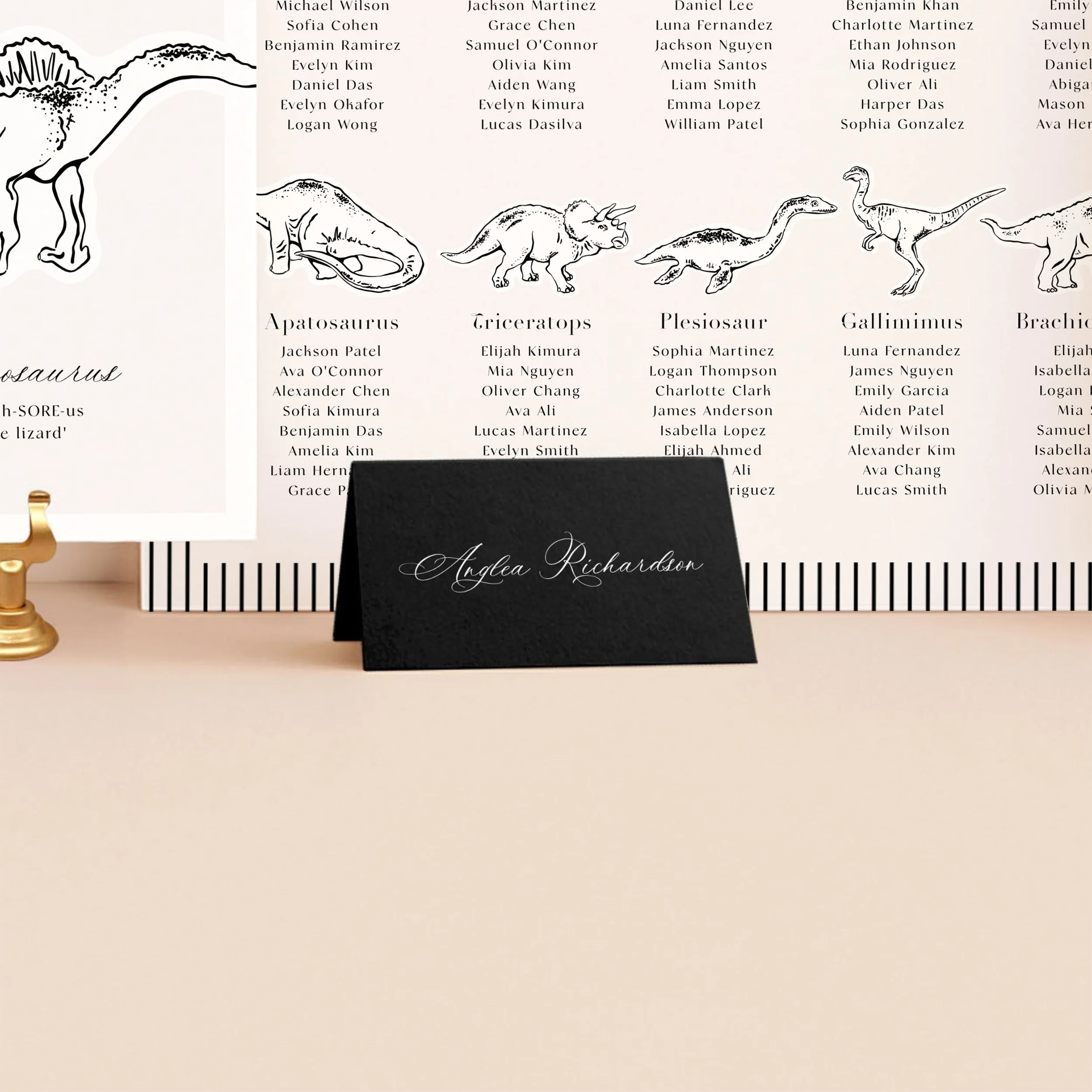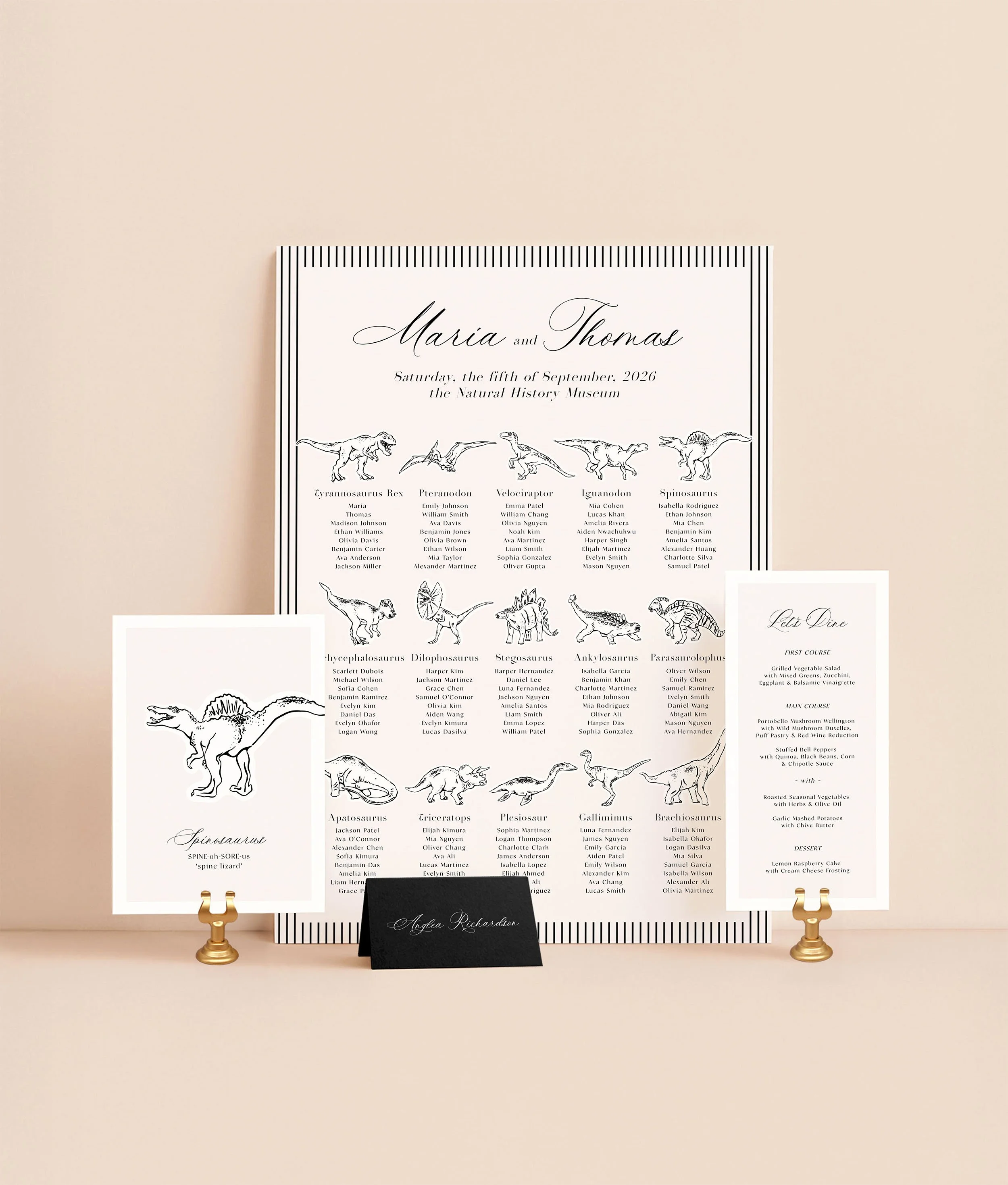 Striped Jurassic features refined line drawings inspired by dinosaurs, offering a playful nod to the childhood favourites while keeping the overall design timeless and understated. Clean lines and a minimalist layout allow the illustrations to shine, making it perfect for your Natural History wedding theme.