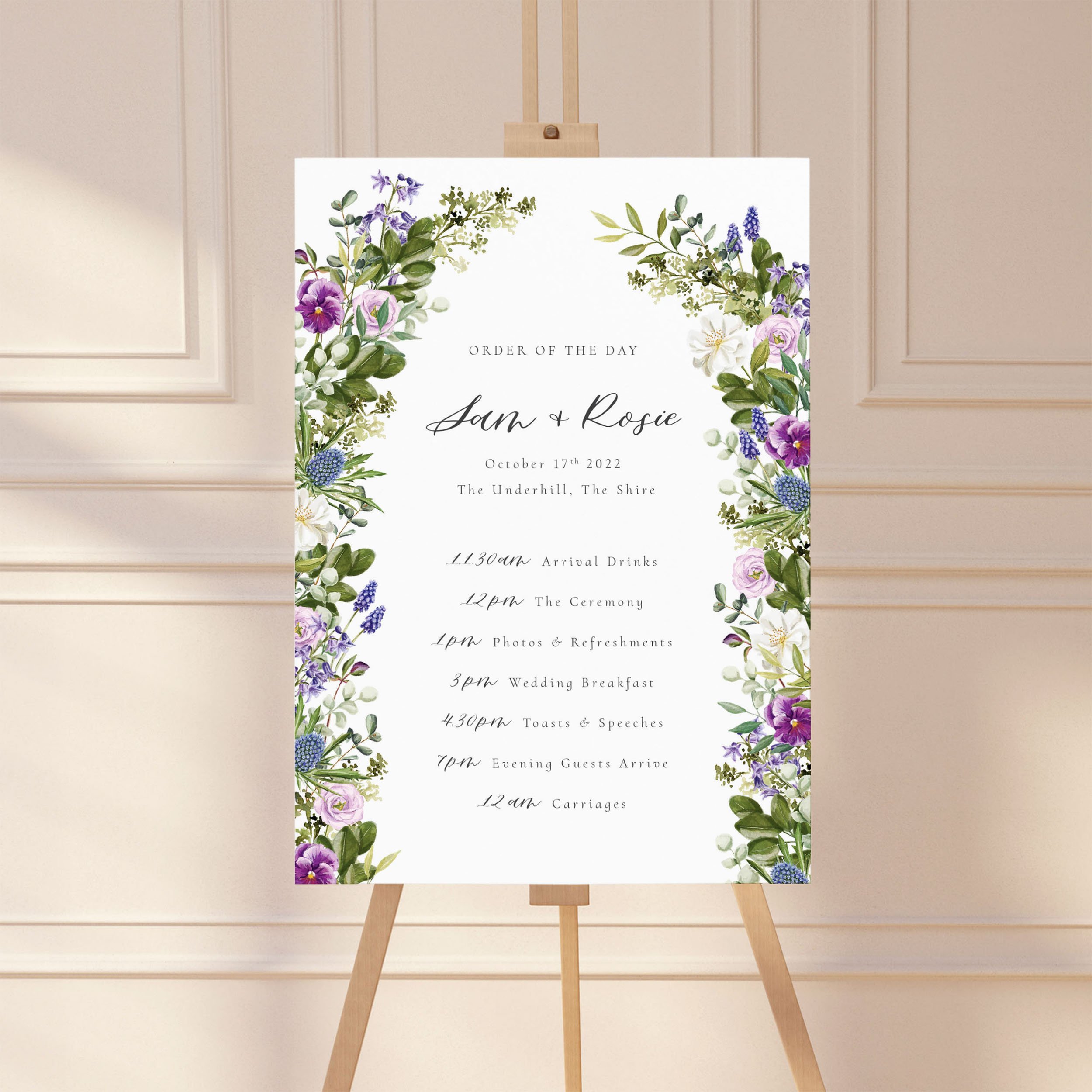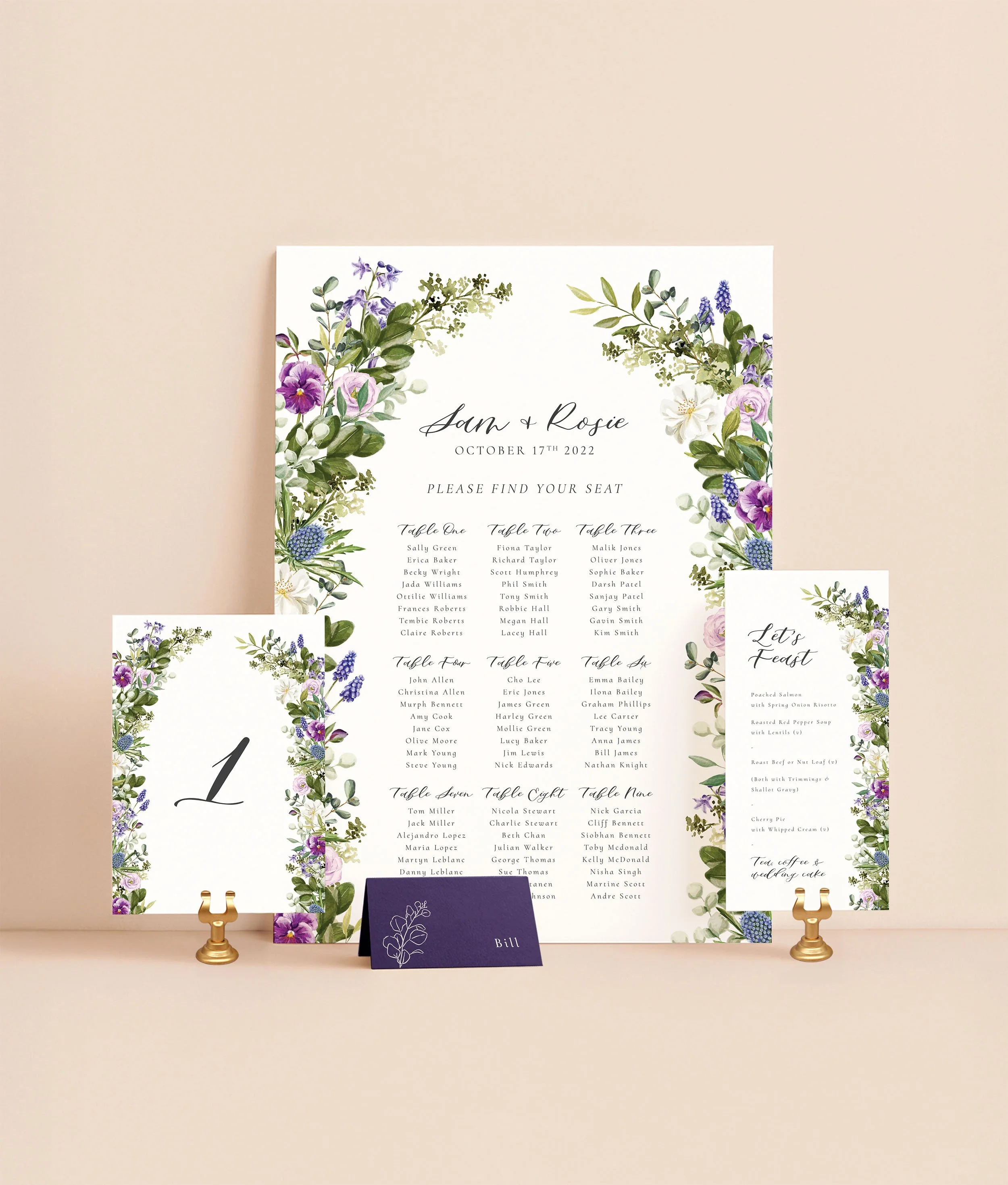 This printed bundle, with rich burgundy florals and lush hand-painted watercolour greenery, includes all the essential stationery for your wedding reception, plus include a welcome sign and order of the day timeline at a discounted price when you order this bundle.