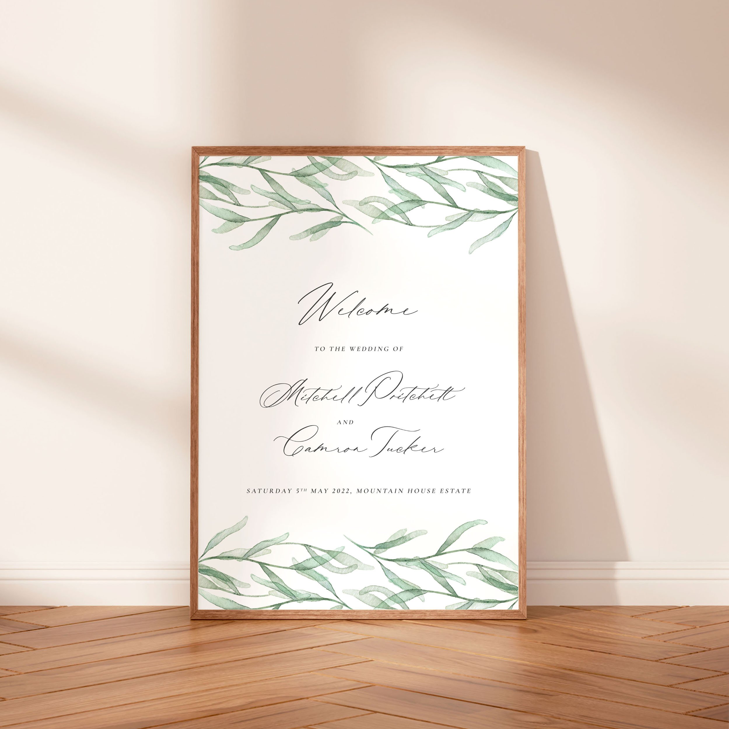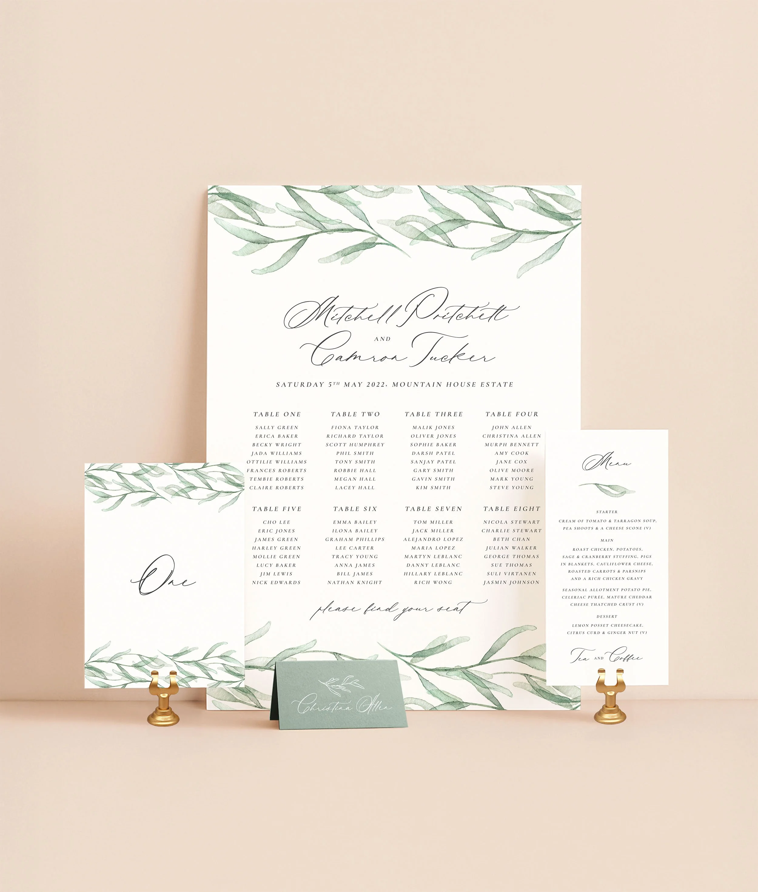 This printed bundle, with rich burgundy florals and lush hand-painted watercolour greenery, includes all the essential stationery for your wedding reception, plus include a welcome sign and order of the day timeline at a discounted price when you order this bundle.