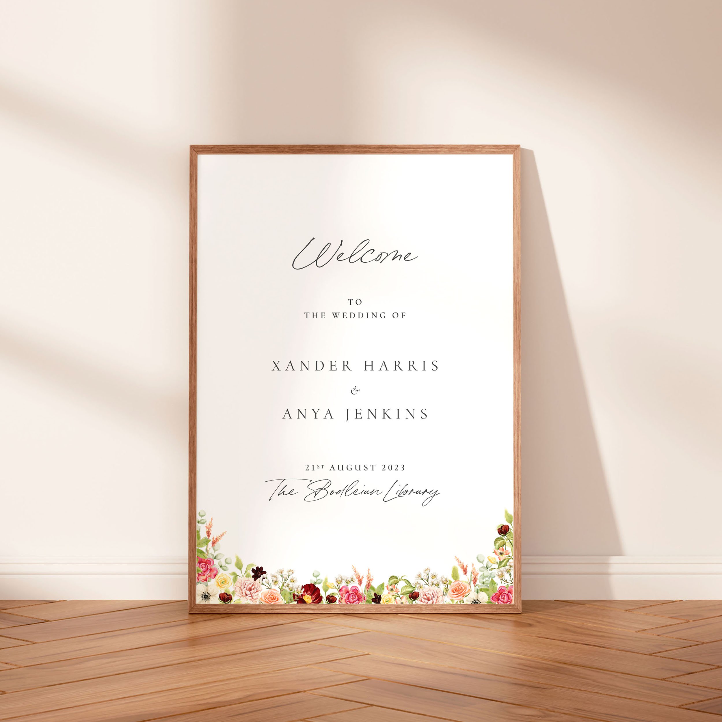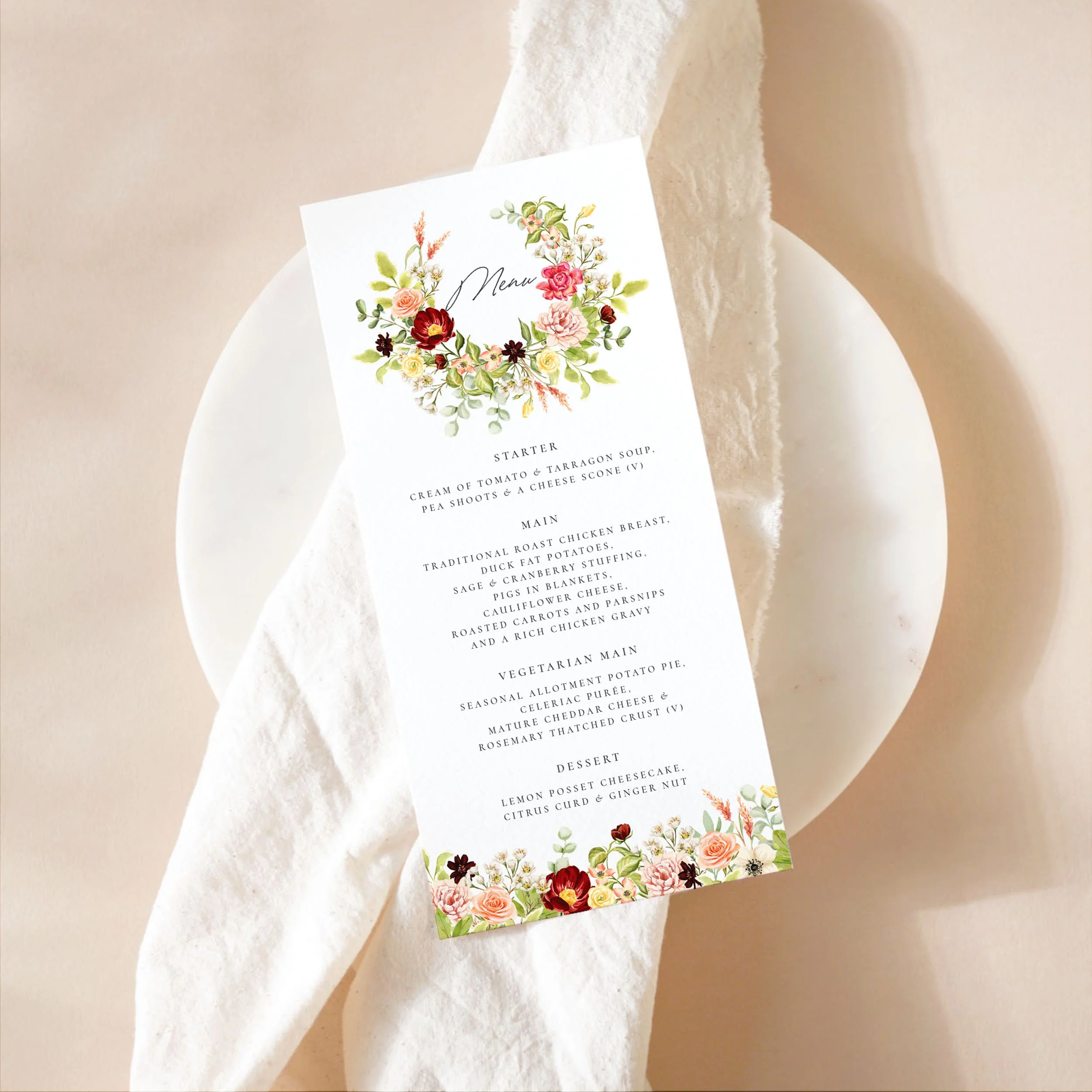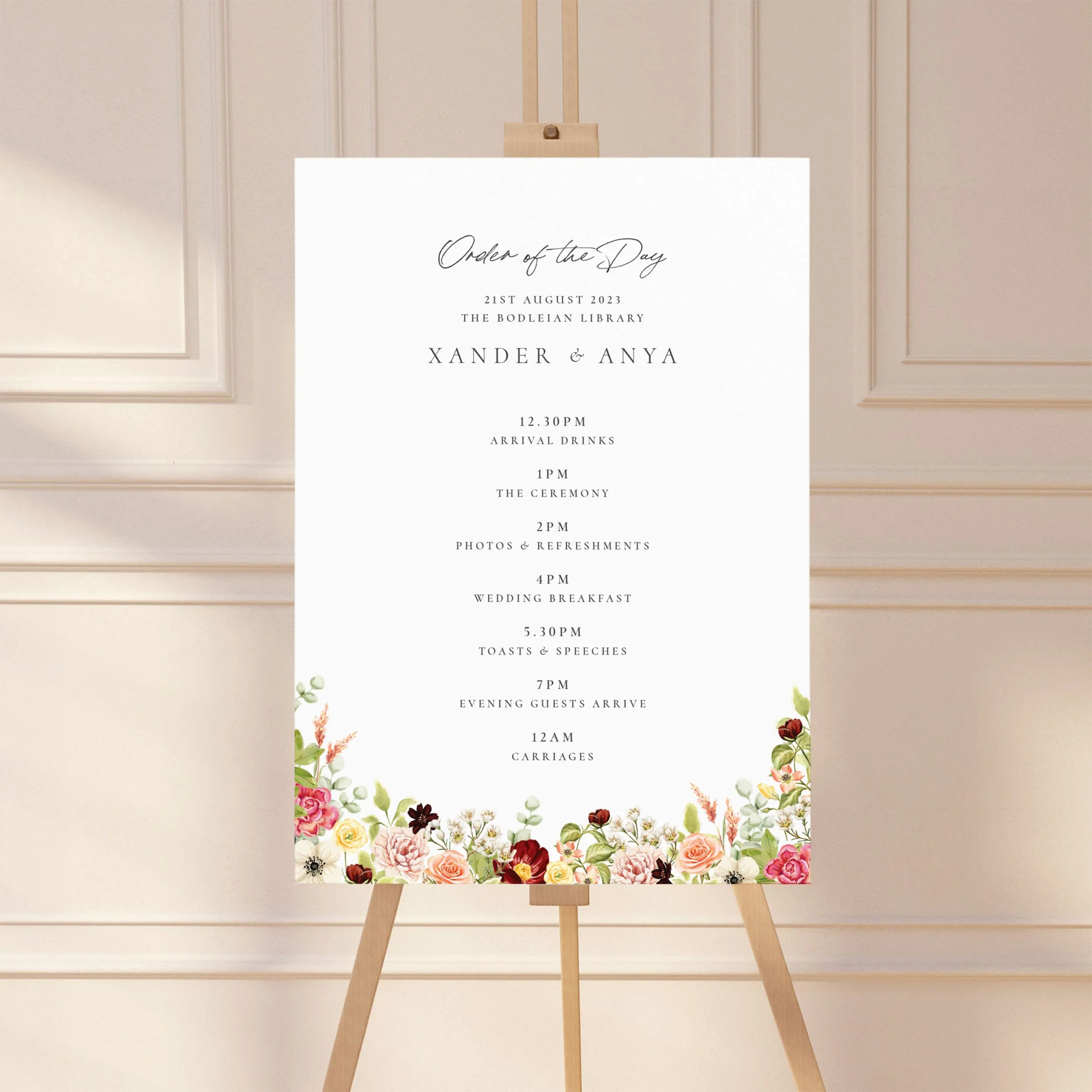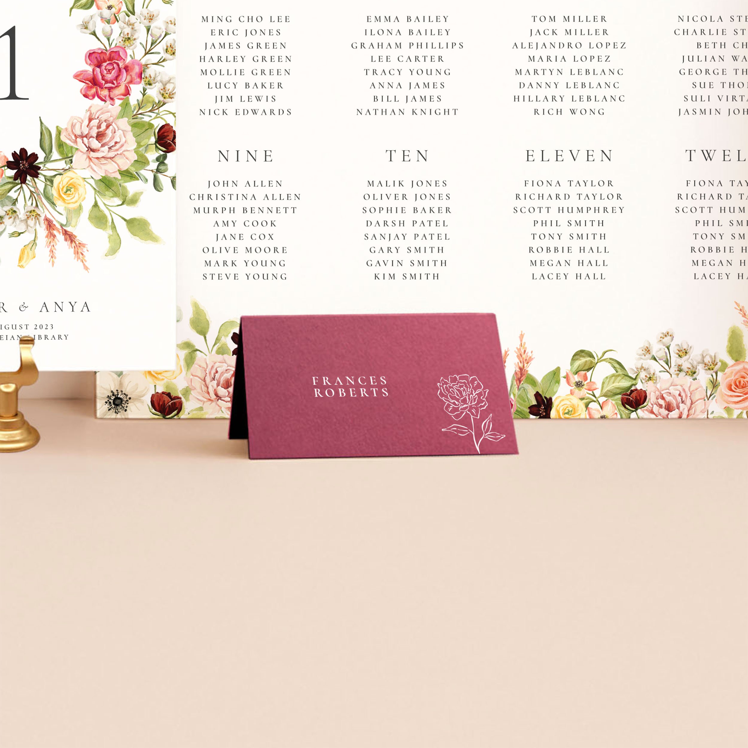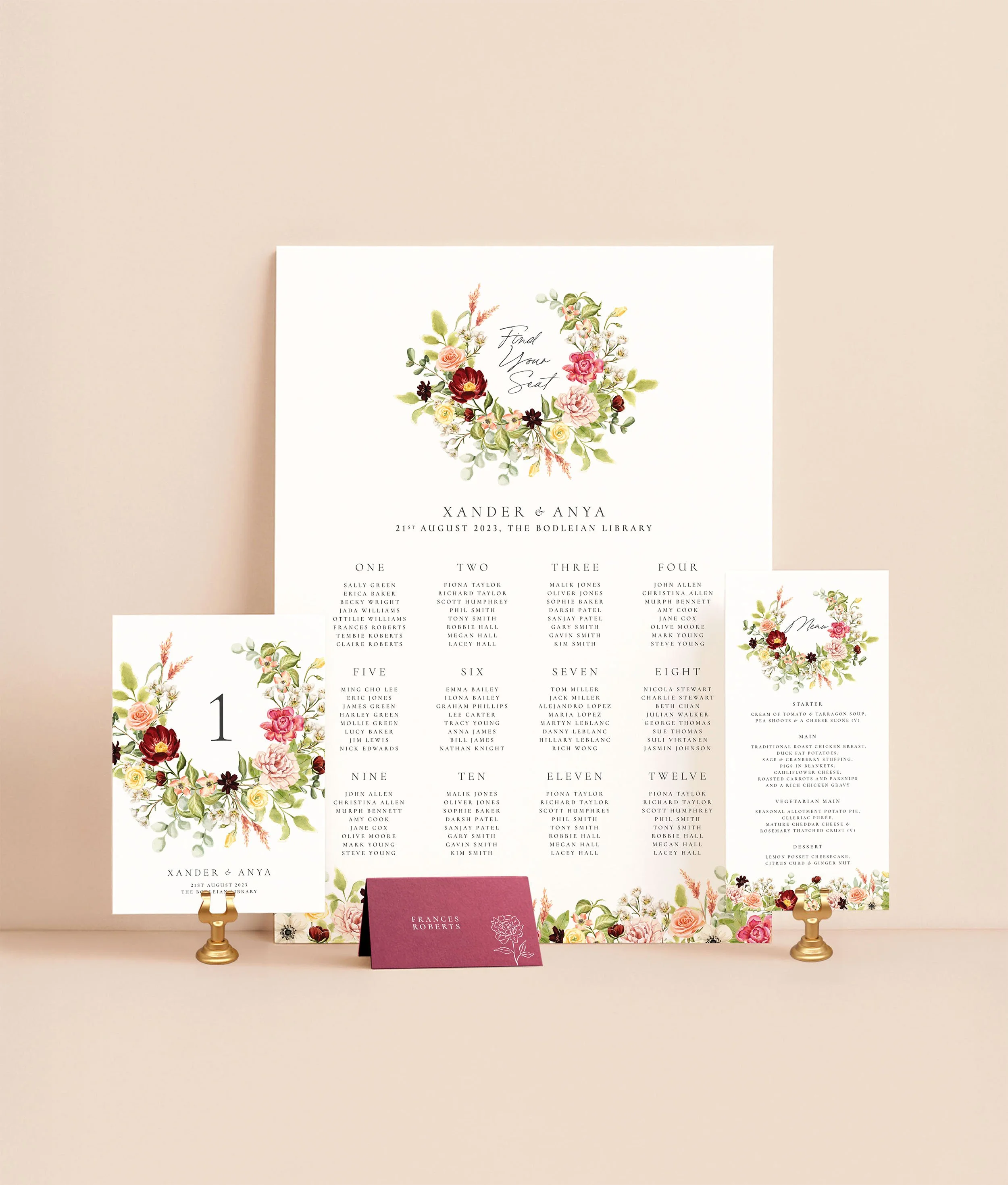 The Whimsy reception essentials bundle features a floral crest with hand-painted watercolour floral blooms in soft shades of pink, burgundy and lush greens, bringing a delicate, whimsical touch to your wedding day decor.