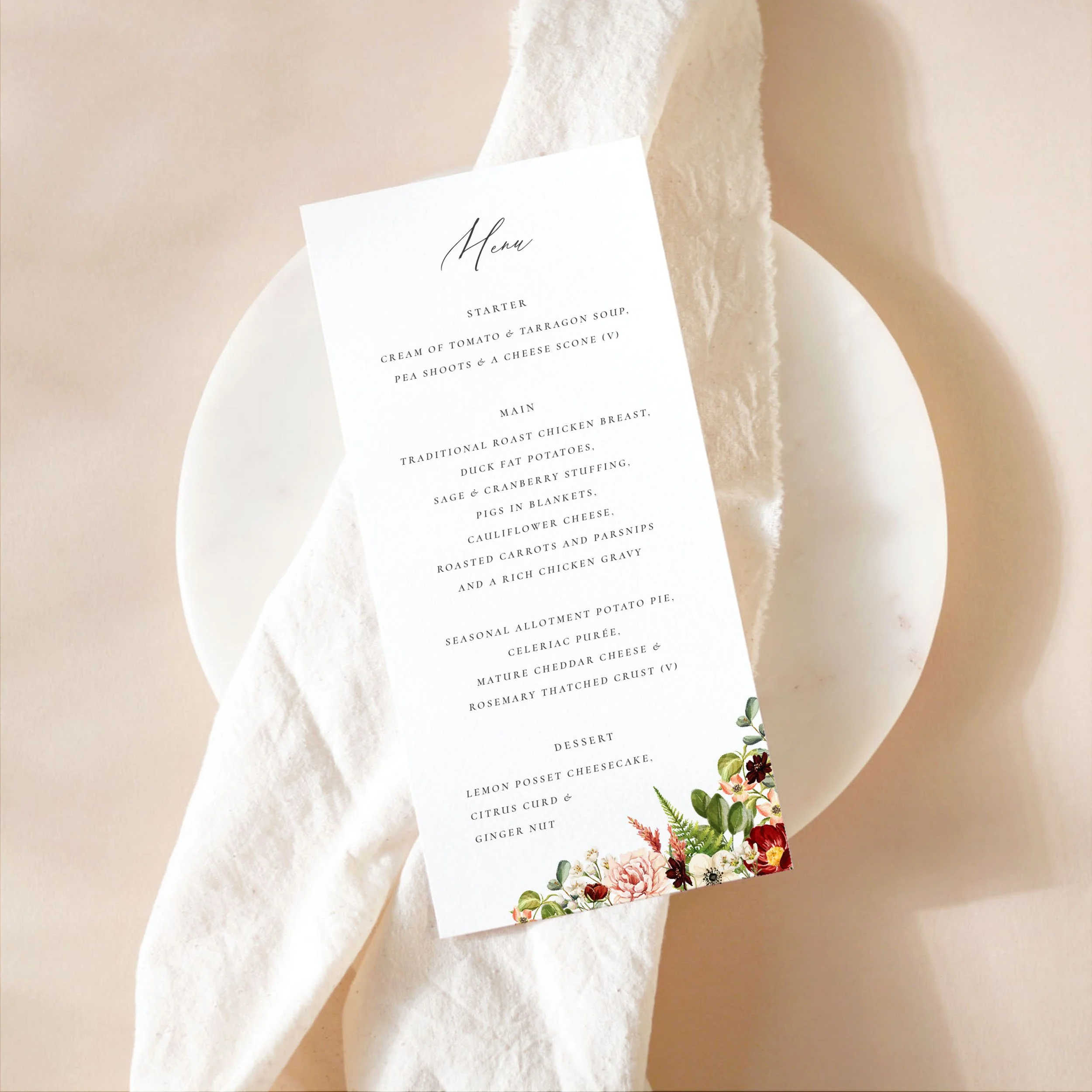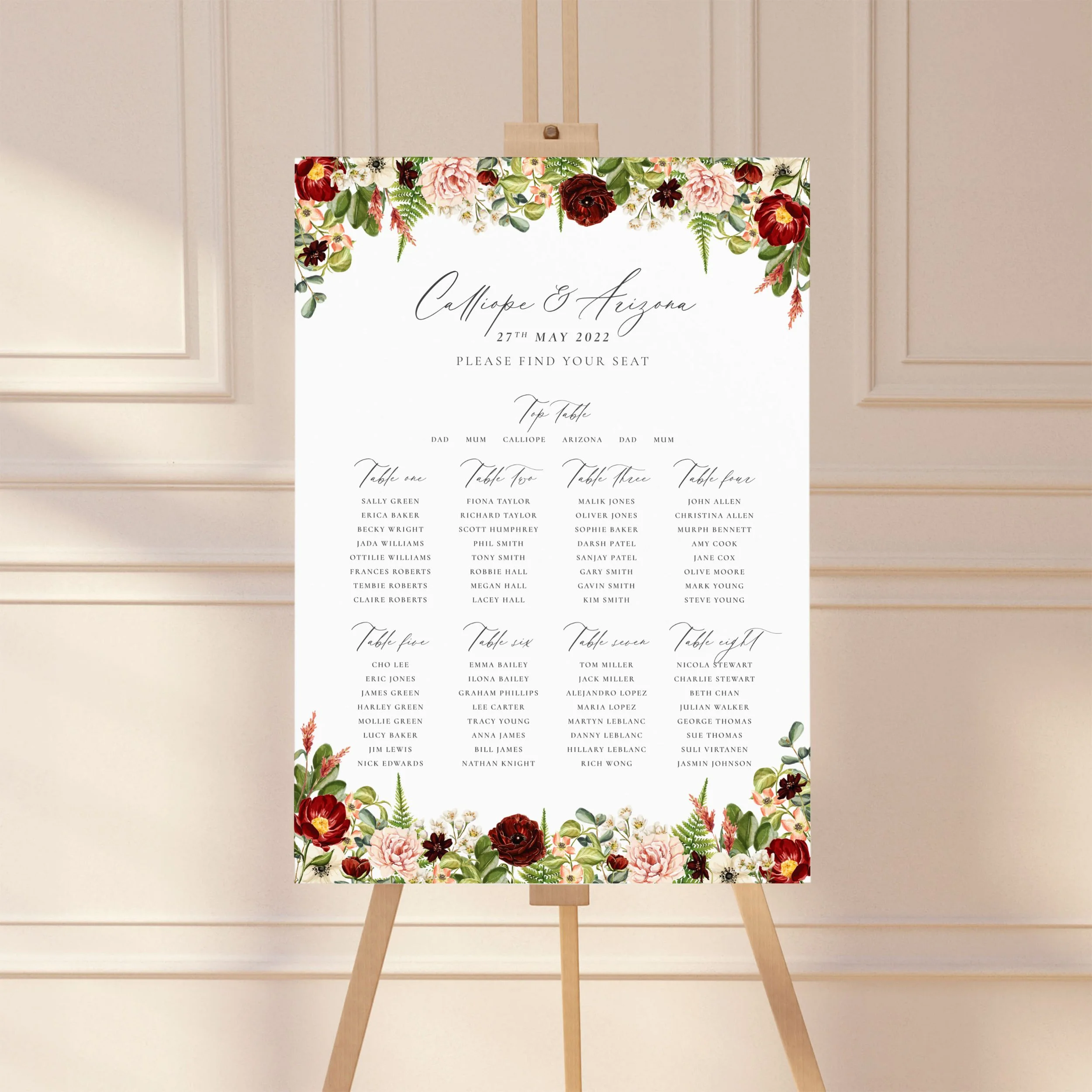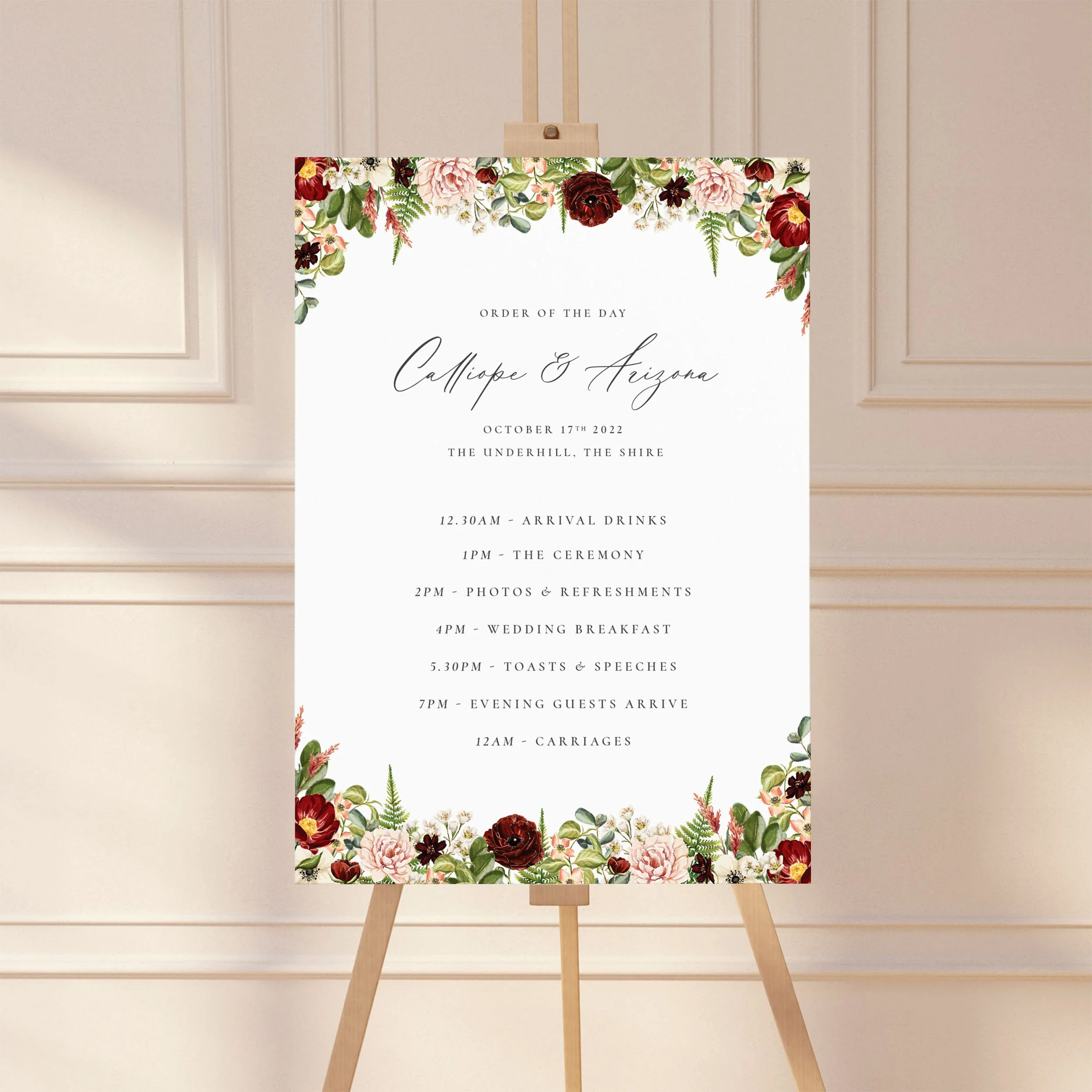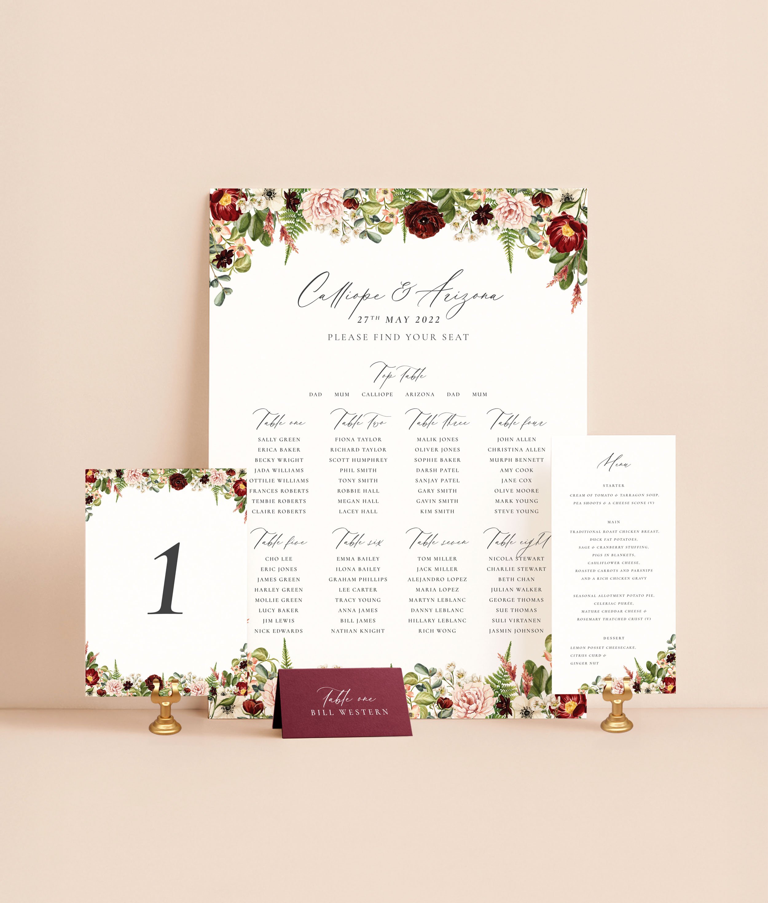 This reception bundle features rich burgundy florals, soft pink blooms, and lush hand-painted watercolour greenery. Inspired by outdoor ceremonies in cosy woodland settings, it brings a warm, romantic, and naturally elegant touch to your wedding day styling.